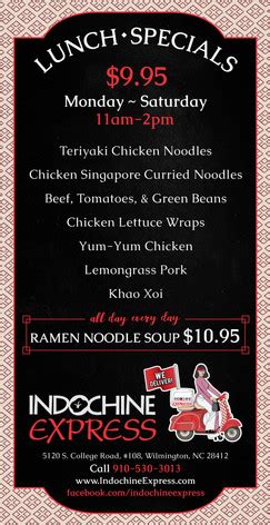 Indochine Express - Monkey Junction Menu. Serving wilmington's monkey junction and surrounding areas. Call 910.251.9229 order online >> get directions >> 7 wayne drive market street at forest hills wilmington, nc 28403 send us an email >>