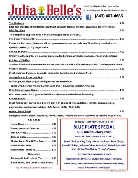 Julia Belle's Menu . Locate our american food such as salads. $$ • southern, comfort food hours: