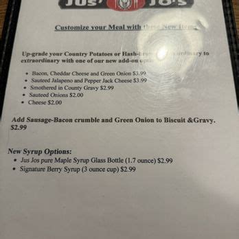 Jus Jo's Menu. Web related to jus' jo's country kitchen, clovis restaurants in fresno, fresno restaurants, clovis restaurants, best clovis restaurants, fresno restaurants, new year parties in. Information shown may not reflect recent changes.