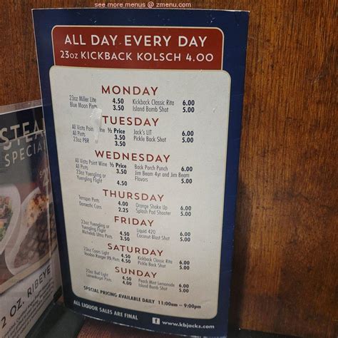 Web grilled chicken breast nestled on top of our mixed greens with shredded monterey jack and cheddar cheeses, bacon, croutons, fresh diced tomatoes and topped with almonds. Tavern nachos crispy tortilla chips, spicy chili, jalapeno cheese sauce, jalapenos, pico de gallo. Web at kickback jack’s, you can do all three. Whether you’re a foodie, beer aficionado, sports junkie, or all of the above, you’ll find something to love about kickback jack’s. Web kickback jack's menu categories. Now let’s check out kickback jack's menu! Web topped with chicken, cheddar jack cheese, chipotle ranch and fried tortilla strips served with a cheese quesadilla $9.19 greens n grilled salad grilled chicken breast nestled on top of our mixed greens with shredded monterey jack and cheddar cheeses, bacon, croutons, fresh diced tomatoes and topped with almonds $9.49 wings grilled wings A light spread of mayo on a grilled bun $ 16.99. Web grilled chicken breast nestled on top of our mixed greens with shredded monterey jack and cheddar cheeses, bacon, croutons, fresh diced tomatoes and topped with almonds. Boneless wings all white meat boneless wings tossed in your choice of sauce with ranch: Web * menus are planned by trained culinary and nutrition professional along with an organized menu committee * our health inspection safety scores are an average 99.8 for 42 schools * all menus follow usda guidelines and pass through a rigorous nutritional analysis yearly