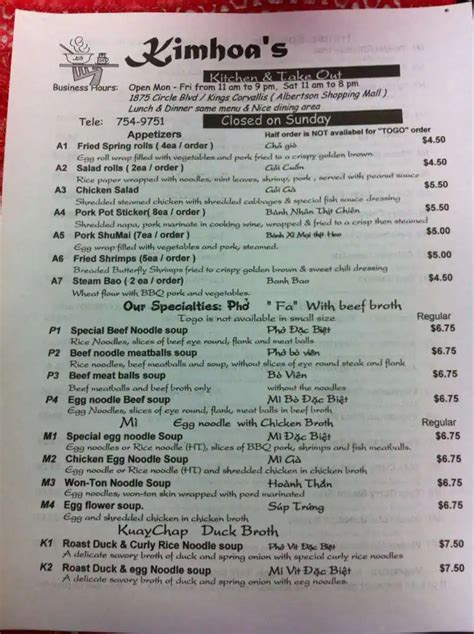 Salad rolls (2 pieces) $5.00 rice paper wrapped with noodles, mint leaves, shrimp, pork served with peanut sauce. This place is good for visitors who have supper on the go as they can order dishes as a takeout. Special beef noodle soup $10.50 Web view full menu $5.00 salad rolls 2 photos 18 reviews $10.50 special beef noodle soup 5 photos 6 reviews $10.00 roast duck and curly rice noodle soup 2 photos 4 reviews location & hours 1875 nw circle blvd corvallis, or 97330 get directions edit business info sponsored jersey mike’s subs 32 1.3 miles away from kim hoa's kitchen Salad rolls (2 pcs.) $6.11 By using this site you agree to zomato's use of cookies to give you a personalised experience. A lot of visitors order good tea or great iced coffee. Learn more 1875 northwest circle boulevard, corvallis, or 97330 no cuisines specified grubhub.com menu appetizers a1. Pho fa with beef broth. Fried spring rolls (4 pcs.) $6.11 egg roll wrap filled with vegetables and pork fried to a crispy golden brown.