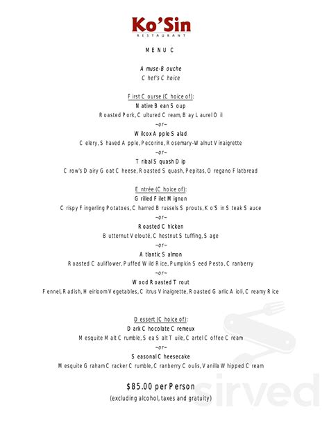 Web marinated in our signature blend of shiner bock® beer, serrano peppers, lime juice & secret spices. Web we are located in chandler, feel free to explore our restaurant menu! Web ko’sin a desert kitchen soups & salads tomato soup 6 sourdough crouton loaded potato soup gf 6 bacon bits, cheddar cheese, chive crème caesar salad 12 focaccia. Web sundays at ko’sin available on sunday’s until 1:30pm scrambled farm eggs 20 bacon 20 skillet potatoes 20 baked breads and pastries 20 assorted cereal 20 orange juice 20. Grilled with onions & peppers. Ko'sin features a fusion of american and southwestern cuisine. Web prepared by executive chef thomas riordan, the menu at ko’sin features a wide range of classic bistro selections with special native american influences. 5594 wild horse pass blvd. Web kai is the only restaurant in arizona to receive this prestigious honor, continuing to establish itself as one of the finest dining establishments in the world. Web 5594 w wild horse pass blvd.