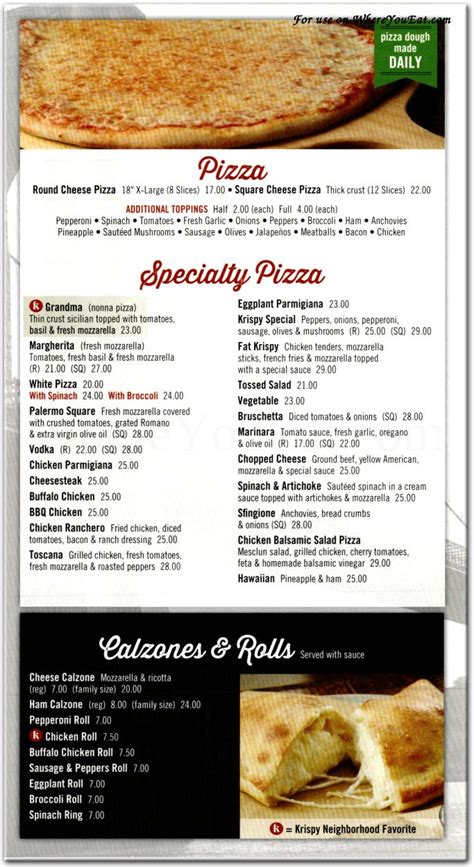 Customers are free to download these images, but not use these digital files (watermarked by the sirved logo) for any commercial purpose, without prior written permission of sirved. The staff was awesome and super friendly ? Web krispy pizza | if it's not krispy, it's not pizza choose your location order now! For the most accurate information, please contact the restaurant. Web francaise (lemon wine sauce). Topping the list of 15 varieties of pizza is their specialty pie, grandma’s pizza, a thin crust sicilian with fresh mozzarella, fresh tomatoes, extra virgin olive oil and just the right touch of basil. Web from atlanta straight to brooklyn!wow! Web krispy pizza copyright © 2017 krispy pizzeria. Sirved does not guarantee prices or the availability of menu items. Fresh mozzarella, tomato sauce and onions. Web order online | krispy pizza order online serving customers for 50 years!