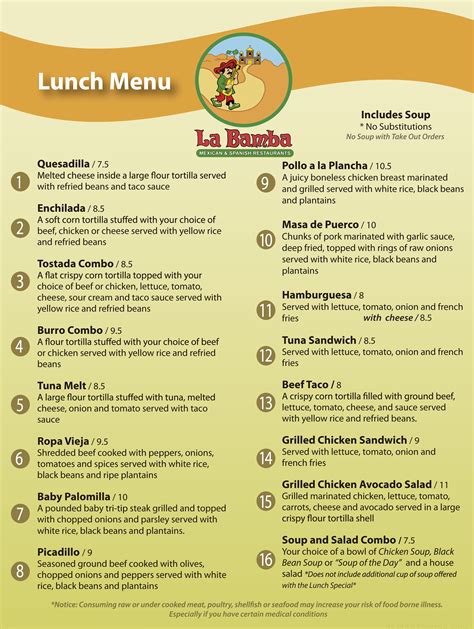 See more of la bamba spanish restaurant on. Served with rice and refried beans. Web la bamba spanish restaurant · may 13, 2020 · lunch menu. Flour tortilla stuffed with refried beans, chicken or beef, covered n melted shredded cheese and our vegetable sauce. Web served with lettuce, jalepenos and sour cream. The new bar is larger and the table area next to the bar is inviting. I came in for dinner, but i will definitely come back more often for their lunch specials as well. Web we provide our customers with a fun and happy environment along with our enthusiastic staff, always making sure our customers have the greatest time in our restaurants. Web dinner menu (click to enlarge) copyright © 2023 la bamba mexican grill, all rights reserved. Web crispy chicken corn tortilla rolls with red mild salsa, fresh cheese, sour cream, guacamole and pico de gallo.