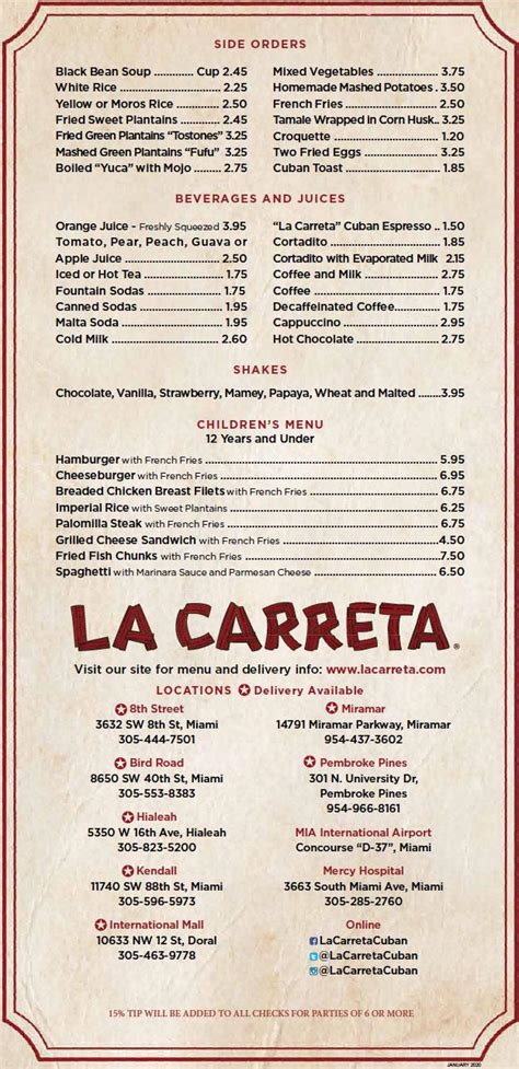 La Carreta Menu, Menu for La Carreta, Doral/Miami Springs, Miami