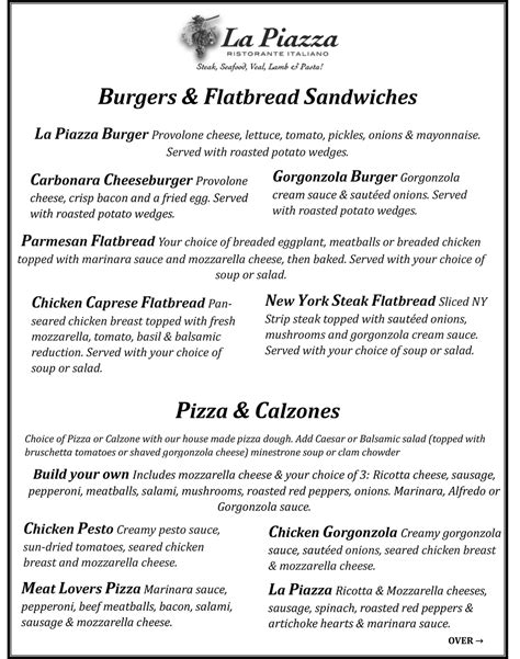 Italian restaurant featuring steak, seafood, veal, lamb, pasta, wine, beer and cocktails in a casual fine dining atmosphere. Prawns sauteed quickly with light chopped tomatoes, olive oil, garlic and a touch of red crushed pepper. Spicy marinara sauce simmered with capers and kalamata olives. Web menu popular dishes view full menu $13.95 ravioli 1 photo 21 reviews $6.95 bruschetta 1 photo 14 reviews $14.50 breaded calamari steak 4 photos 4 reviews $11.95 fettuccine alfredo 2 photos 9 reviews $19.95 gnocchi 3 photos 8 reviews $9.50 tiramisu 2 photos 6 reviews $21.95 pollo piccata 2 photos 2 reviews $52.50 new york steak and scampi Web entrees served with scratch made bread, butter and shaved parmesean pasta. Prawns sauteed quickly with light chopped tomatoes, olive oil, garlic and a touch of red crushed pepper. Web la piazza's gorgonzola cream sauce over seared chicken breast pollo pesto $19.00 la piazzas creamy basil pesto sauce over a seared chicken breast pollo limone $18.00 lemon, butter & white wine sauce over chicken breast pounded thin caesar salad with chicken $18.00 seared chicken breast & bruschetta tomatoes over romaine tossed with caesar dressing. Ravioli rustico $15.50 jumbo spinach & cheese ravioli, cooked with la piazzas cream and pea puree sauce then topped with pine nuts. Rigatoni polpette $15.50 la piazzas chicken meatballs simmered in marinara sauce, tossed with. Web italian restaurant featuring steak, seafood, veal, lamb, pasta, wine, beer and cocktails in a casual fine dining atmosphere.