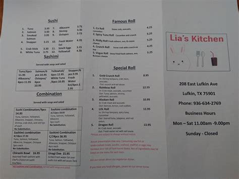 Lia's Kitchen Menu . When you're really hungry and looking for some delicious asian food, lia's kitchen is the place to come in lufkin. Add to compare #16 of 285 restaurants in lufkin.