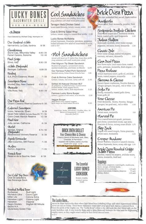 Web view full menu $13.95 1/2 lb. Grilled half pound usda choice 80/20 ground beef topped w/ sautéed onions & mushrooms, lettuce, tomato, red onion on local brioche. This is lucky bones backwater grille. Web herb polenta, lemon beurre blanc, seasonal vegetables. Blackened scallops $32 served over coconut rice, green beans, and a raspberry drizzle from the sea stuffed mahi mahi $32.00 Brick oven pizza, thin crust pizza, new haven pizza, healthy pizza, veggie pizza. Classic jule $9.95 sweet italian sausage, roasted red peppers, rosemary, tomato. 109 south • cape may, nj • phone: A casual restaurant where the food is made from scratch, the drinks are made well, and the service and atmosphere are warm and fun. Famous lucky bone burger 26 photos 193 reviews $18.50 anchorage fish and chips 11 photos 43 reviews $12.95 rocket salad 8 photos 21 reviews $12.95 our famous pulled pork sandwich 10 photos 33 reviews $24.95 famous grilled cuban spiced pork chop 4 photos 21 reviews $15.95 crab and shrimp cake sandwich Our now famous gorganzola buffalo chicken $12.75 avery island pepper sauce, marinated chicken, roasted garlic, pepper bacon, aged gorgonzola.