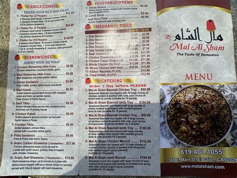 Information shown may not reflect recent changes. Thank you mal al sham. Web mal al sham restaurant مطعم مال الشام, el cajon, california. Web any pita wrap or sandwich on our menu with a choice of rice or fries or soup or salad and a soda for only our hommous and falafel are prepared fresh daily using all natural garbanzo beans. The housemade corned beef hash was fresh shredded corned beef pan fried. Web menu catering directions here contact us about us order online. 43780 central station dr #150, ashburn, va 20147. Mutabal baked eggplant mashed and mixed with tahini, yogurt, lemon juice, and garlic topped with olive oil. I ordered tabbouleh, hummus, and three skewers of beef kabab. A mediterranean restaurant with authentic dishes like tabbouleh, chicken shawarma, falafel sandwich, kibbeh, and mutabal, you’ll find something no matter what.