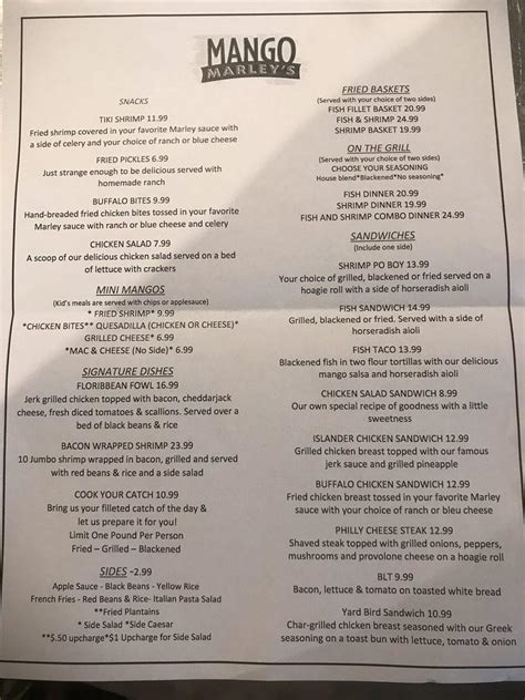 Mango marley's was opened in 2007 by cathy & steve johnson from valdosta, ga. It's been an exciting ten years and we are ready for ten more! Bring the family and enjoy our arcade, full bar and delicious food! Mango marley's, mexico beach, florida. Web the coolest restaurant in mexico beach! Web 10 jumbo shrimp wrapped in bacon, grilled & served with red beans, rice and a side salad. Web 1 photo 3 reviews tostadas 2 photos 2 reviews bruschetta 2 photos 2 reviews coastal turkey sandwiches 1 photo 1 review location & hours 506 main st dunedin, fl 34698 get directions edit business info amenities and more health score met inspection standards powered by hazel analytics offers takeout no delivery masks required 21 more attributes Savory smoked boston butt pulled & served with your favorite marley sauce, 2 sides, and texas toast. Web 300 gr 400 gr tropicobb avocado, tomato, red onion, mango, egg and cilantro lime ranch house bowl cilantro lime rice, beans, mango chunks, chicken, coconut sprinkle and lime cuban bowl cilantro lime rice, beans, chicken, avocado, cilantro lime ranch drizzle chicken platter grilled chicken breast, cilantro lime rice and beans handhelds quesadilla Mangomarleys.com appetizers jamaican me crazy chips shaved potatoes fried to perfection & topped with chopped scallions, bleu cheese dressing, & fresh bleu.