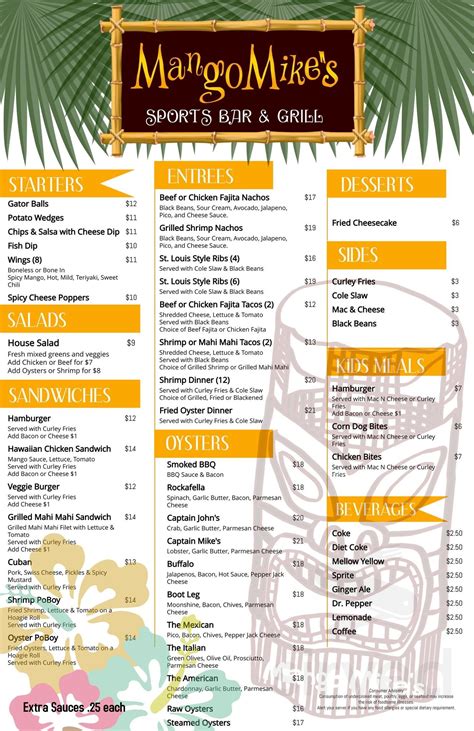 Web mango mike’s sports bar & grill, on st. Web no matter what you are hungry for, you’ll find a huge variety of delicious dishes to satisfy you at the mango mike's menu. Web mangrove mike's in islamorada, fl. Full bar, liquor beer and wine. Web menu mango's island potions big bamboo $7.59 a traditional pina colada served with in freshly hulled island coconut parrot cooler $9.95 jolly mon margarita $9.95 puka puka. Web mango mike’s sports bar & grill, eastpoint, florida. Web menu menu for mango mike's appetizers calypso fried calamari lightly breaded rings, flash fried and served with spicy cocktail sauce $7.95 crab cake appetizer two 2.5 oz. Mango mike’s sports bar & grill is a family friendly full service. Check out our location and hours, and latest menu with photos and reviews. Web restaurants package items to maintain temperature, quality, and freshness and to ensure delivery orders hold up during trips to customers.