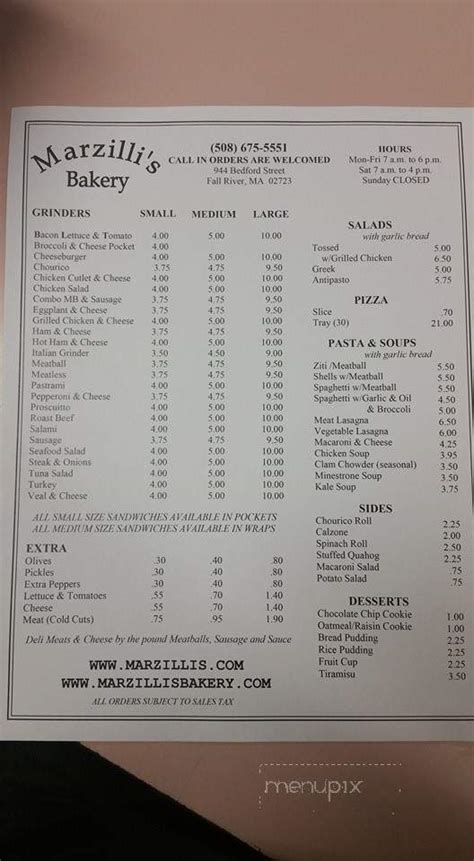 Web view the menu of marzillis bakery inc. Chicken soup $4.20 clam chowder $5.75 seasonal. Grinder shop marzillis bakery inc. In 944 bedford street, fall river, ma. Web spaghetti with garlic & oil & broccoli $6.00 meat lasagna $7.80 macaroni & cheese $5.10 beef stew $4.75 seasonal. Minestrone soup $4.20 kale soup $4.50 sides chourico roll $2.70 calzone $2.40 spinach roll $3.00 stuffed quahog $3.00 macaroni salad $1.00 potato. Our staff works hard to make sure that everything we produce is of excellent taste and quality. Share it with friends or find your next meal. Web marzillis bakery serves some of the best american daily. Other than buns and rolls, we serve pizzas, soups, salads, and grinders that are made from our freshly baked bread.