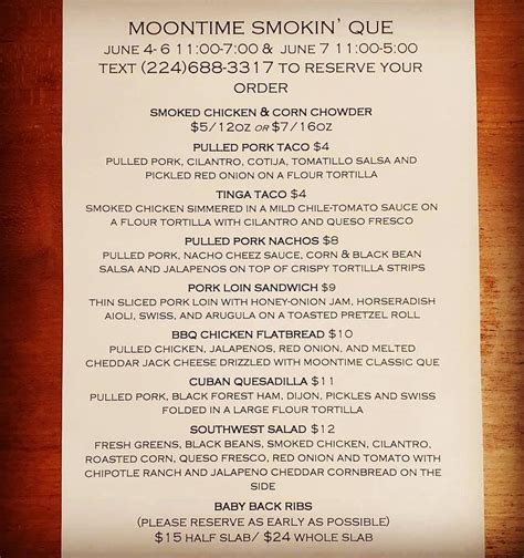 Moontime Smokin Que Menu . Enjoyable service is something guests appreciate here. 3,015 likes · 8 talking about this · 13,303 were here.