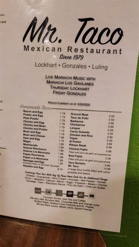 The taco had that perfect crunch with a very well made taco meat. Mr taco menu and price order online a la carta sopas/soups show more store location on map view map For detailed hours of operation, please contact the store directly. Web menudo 5 reviews $9.29 served with onions, cilantro, lime, chopped fresh jalapenos and tortillas caldo $10.29 beef or chicken soup with fresh vegetables. Web mr taco menu dinner plates. One enchilada, guacamole salad and one crispy taco topped with meat, lettuce,. Web tasty dishes in luling meat salsa rice casserole soup chicken cheese bacon pork beef guacamole broth migas burgers chili steaks fried chicken chorizo nachos seafood quesadillas restaurant features in luling takeaway great service friendly staff lunch breakfast dinner birthday party wedding cosy atmosphere great location outdoor seating 377 likes · 6 talking about this · 35 were here. Served with a side of rice, lime, and tortillas taco salad $6.99 a fried tortilla bowl filled with ground beef, lettuce, tomatoes, cheese, guacamole and sour cream guacamole salad $5.29 Beef or chicken soup with fresh vegetables. Everything on the plate was great, i enjoyed the beef enchilada way more than the cheese enchilada, the flavor of the beef gave it that little extra it needed.