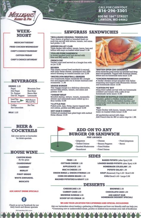 Menu of Mulligans Eatery and Pub in Lawson, MO 64062