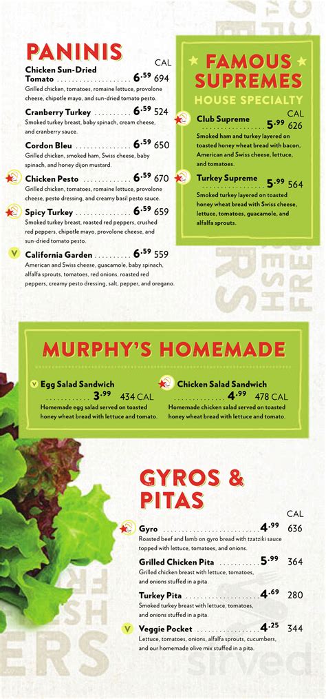 Web great taste, quality, and fresh ingredients. Take out menu catering menu. If ben stein was a sandwich, he'd have been launching fireworks in my mouth compared to this pathetic murphy's deli sandwich. Web information on restaurant locations, catering, and franchise and employment opportunities. Great taste, quality, and fresh ingredients have been the hallmark of murphy’s deli. View the menu for murphy's deli on menupages and find your next meal. Items and pricing may differ per location. Romaine hearts, tomatoes, purple cabbage, carrots, and cucumbers topped with tuna salad and served with your choice of dressing. Buffalo chicken, shredded romaine hearts, shredded cheddarjack cheese, onions, tomatoes, and bleu cheese dressing. Web i ordered a ham and swiss sammich.