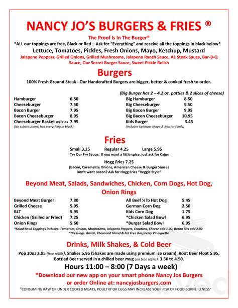 Nancy Jo's Menu . Reviews and photos of bacon cheeseburger. Online ordering has never been easier!