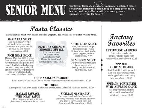Old Spaghetti Factory Senior Menu. Web the old spaghetti factory menu and prices. They offer pasta classics, appetizers, entree salads, the.