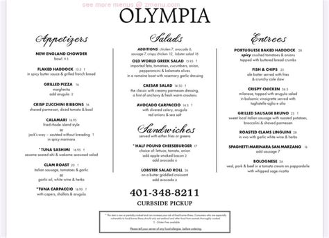 Olympia Tea Room Menu . Browse the menu available menus main menu main menu main menu info stay updated about olympia tea room's offers make a reservation order online find the best restaurant in watch hill description. There is no lunch menu the dinner menu is offered all day.