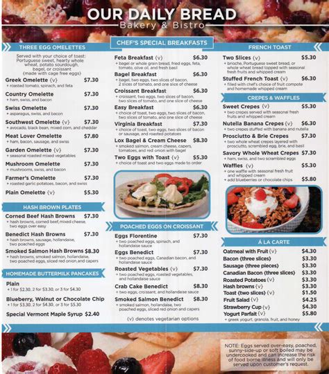 Web daily breakfast features friday, february 17th blueberry nut french toast brioche french toast, fresh blueberries, walnuts, chocolate sauce, whipped cream, and dusted with powdered sugar $8.50 egg lover’s plate piece of quiche lorraine, garlic roasted potatoes, two poached eggs, and hollandaise sauce $9.00 andouille omelette Web menu popular dishes view full menu price varies french 9 photos 28 reviews $1.50 sugar cookies 1 photo 4 reviews wedding cakes 1 photo 4 reviews $5.95 brioche 1 photo 4 reviews full menu location & hours 1329 s main st blacksburg, va 24060 get directions edit business info amenities and more offers delivery offers takeout no reservations Menu added by the restaurant ownerjune 02, 2021. Our daily bread bakery and bistro. We serve breakfast, lunch, and dinner as well as a variety of pastries, cakes, pies and breads. #6 of 109 cafesin blacksburg. The restaurant information including the our daily bread bakery & bistro menu items and prices may have been modified since the last website. May include scone drops, mini muffins, banana bread, pumpkin bread, chocolate amish bread, cranberry bread, strudels, croissants, cream cheese crescents, poundcake and other assorted items. Proceed to the restaurant's websiteupload menu. For the most accurate information, please contact the restaurant directly before visiting or ordering.