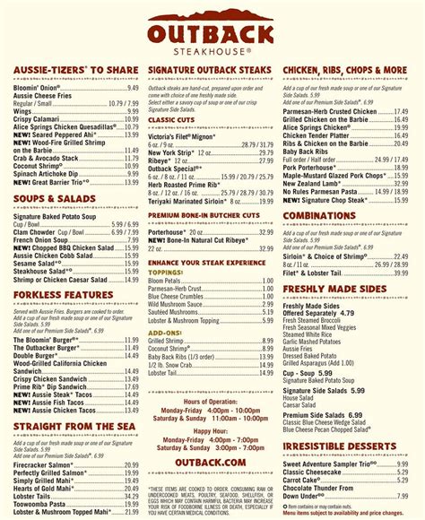 Check hours, get directions, and order takeaway here. Tender with a nice seasoning. For grilled steaks, chicken and seafood, outback also offers a wide variety of crisp salads and freshly. New creations and grilled classics are made from scratch daily using only t……. Serve it up with a dash of aussie hospitality, and you’ve got all the makings of a great experience you’ll want to share with your friends, time and time again. Outback steakhouse will offer you delicious beer or good wine. Web blend of steak, gouda, parmesan and jack cheeses, red bell peppers and onions. Served with your choice of two freshly made side. Web each box includes alice springs chicken (grilled chicken topped w/ sautéed mushrooms, crisp bacon, melted monterey jack and cheddar and honey mustard sauce), and your choice of side. Pay ahead and skip the line. Do not go away without tasting good coconut shrimps, vegetable salads and potato soup.
