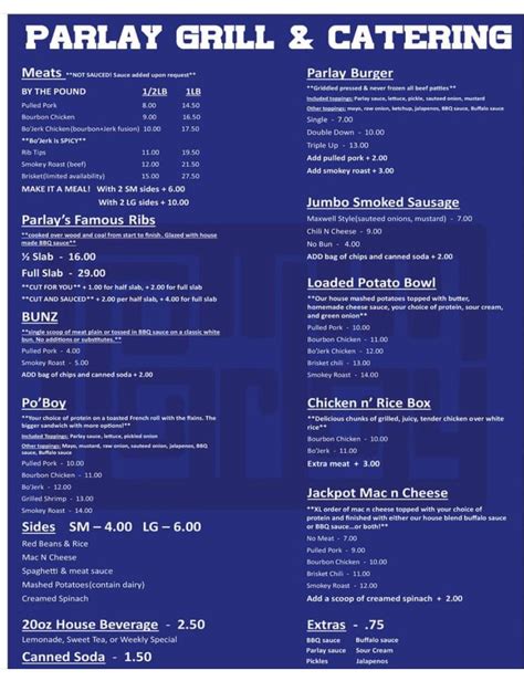 Parlay Grill And Catering Menu. You can search by company name, service, subway station, district, and other keywords… Prices at parlay grill & catering deserve attention as they're adequate.