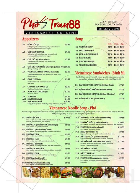 Ratings of restaurants and cafes in texas, similar places to eat in nearby. Web pho tran vu menu and delivery in mountain view. Web we offer a variety selection of vietnamese food such as pho, com tam (broken rice), bun (rice vermicelli), fried rice, banh mi, stir fried dishes, banh xeo (vietnamese pancake),. Web vietnamese noodle grand junction, vietnamese noodle 81505, pho 88. A combination of shrimp, cubed pork, chicken, eggs, chinese sausage and mixed vegetable with fried rice. Web the menu for pho tran88 with category vietnamese from san marcos, 212 n lbj dr, 78666, san marcos, us can be viewed here or added. Web pho tran88 owners steven tran (left) and dao tran (right) pose for a picture, thursday, june 17, 2021, in pho tran88, san marcos. On the street of north lbj drive and street number is 212. @photran88sanmarcostx · 5 32 reviews · pho restaurant. Web view the menu for pho tran and restaurants in houston, tx.
