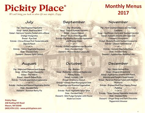 Web menu is for informational purposes only. Web check out the menu for pickity place.the menu includes menu for august, menu for september, menu for october, menu for november, and menu for december. Service was great and we were in the small room that used to be a bedroom. Bread ~ olive oil carving loaf. Web october's menu dip ~ spinach soup ~ creamy onion with pickled shallots salad ~ autumn slaw with candied walnuts bread ~ cranberry orange ciabatta. Add on 2 honey habanero shrimp for $5. Entrée ~ chicken and applewood smoked ham, broccoli and vermont cheddar. Web angus roast beef, crumbled blue cheese, provolone, horseradish aioli. Salad ~ grilled peach, feta and basil. Web june 2023 menu dip ~ chive and garlic soup ~ french onion with gruyere toast salad ~ heirloom tomato caprese bread ~ whole wheat entree ~ tuscan pork rollatini — or — entree ~ zucchini and summer squash ribbon ravioli dessert ~ vanilla bourbon cheesecake with chocolate ganache and fresh strawberries july 2023 menu dip ~ st.tropez garlic