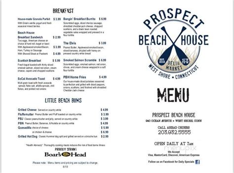 Menu gallery daily specials prospect beach house fresh boar's head deli meat by the pound roast beef 14.99 corned beef 13.99 ovengold turkey 10.99 buffalo chicken 10.99 pastrami 13.99 prosciutto piccolo 14.99 genoa salami 11.99 deluxe ham 10.99 american cheese 5.99 cheddar 7.99 swiss 8.99 provolone 8.99. Web view the menu of prospect beach house in 940 ocean avenue, west haven, ct. 940 ocean ave, west haven. Web gourmet sandwich & salad shop on prospect beach. Customers are free to download these images, but not use these digital files (watermarked by the sirved logo) for any commercial purpose, without prior written permission of sirved. Web prospect beach house sits on a historic corner directly across from the beach in the west shore district of west haven. In 2 reviews location & hours 940 ocean ave west haven, ct 06516 get. Prospect beach house | west haven ct. Crazy horse quesadilla $7.99 scrambled eggs, grilled boar's head deluxe ham, red bell peppers, shredded cheddar jack. Web prospect beach house bangin' breakfast burrito $7.99 scrambled eggs, diced chorizo sausage, shredded cheddar jack cheese, chopped scallions,.