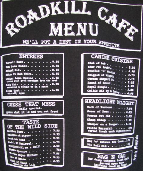 Roadkill Cafe Menu Joke. Web the roadkill café located on america's famous mother road has a menu that would make even the most adventurous delivery worker blanch at the gills. We offer unbiased reviews and advice, bad jokes and a great community for car owners and.