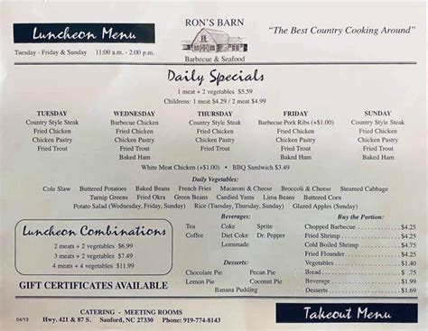 Web ron's barn barbecue & seafood. Good rum is among the best drinks to order. The theme is old western. Some clients recommend delicious tea or great lemonade at ron's barn. The food is wonderful and the service is great too. Useful funny cool ashley o. Web #3 of 65 bbqs in sanford proceed to the restaurant's website upload menu menu added by the restaurant owner the restaurant information including the ron's barn barbecue & seafood menu items and prices may have been modified since the last website update. The banana pudding was great though. Angier, nc 75 147 38 3/30/2015 this is a great place to get bbq, chicken, fish, shrimp, and vegetables. Sirved does not guarantee prices or the availability of menu items.