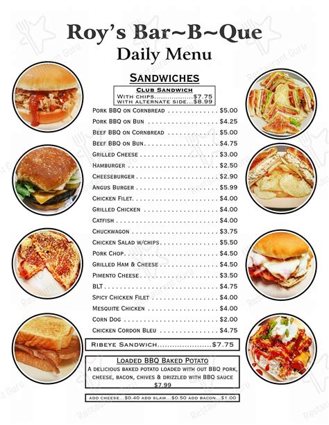 2250 st john ave, dyersburg tn 38024. Beef brisket, turkey, ham, pork, mild polish sausage and hot links sandwich only sandwich meal. Buns made by columbia city. Web roy's bbq menu (pdf) download. See restaurant menus, reviews, ratings, phone number, address, hours, photos and maps. Web pork bbq jr sandwich $2.25. #1 of 22 bbqs in chickasha. Web view the menu for roy's bar bq and restaurants in chickasha, ok. Our restaurant is filled with sports memorabilia as well as trophy deer and fish. Your choice of beef brisket, turkey, ham pork, mild polish sausage and hot links.