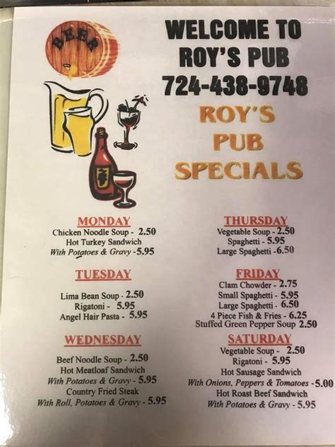 Share it with friends or find your next meal. $$ • bar, american, salad. I've had hoagies fish sandwich i can't remember all items on menue, but my favorite is the dagwood sandwich. Web view the menu of roy's pub in 662 pittsburgh rd, uniontown, pa. Egg cheese bacon ham letuss tomatoes and they serve this fries. Yes just like the cartoon. Web roy's pub is a bar and restaurant. 2,441 likes · 48 talking about this · 536 were here. An example of something special! Web menus were given, however a significant number of menu items were either out of stock, no longer offered, or the prices were incorrect.