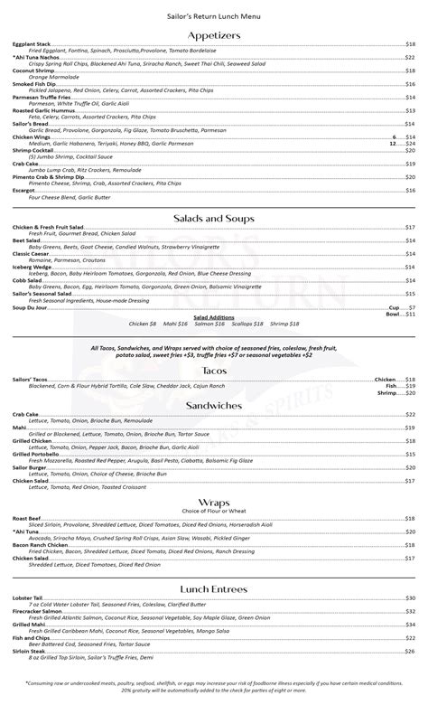 Sailor's Return Lunch Menu . Customers are free to download these images, but not use these digital files (watermarked by the sirved logo) for any commercial purpose, without prior written permission of sirved. Always check with the business for pricing and availability of menu items.