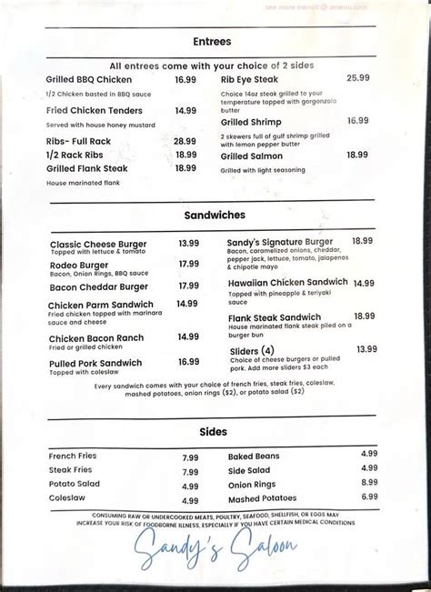 Web view the menu of sandy’s saloon in 47 wardwell rd, orland, me. Web online menu of sandy's stagecoach saloon, blue ash, oh home cincinnati cincinnati cincinnati sandy's stagecoach saloon view menu read reviews write review. Web spinach artichoke dip with chips $8.99. Claim now to immediately update business information. #1 of 3 pubs & bars in orland. Share it with friends or find your next meal. Web menu view menu additional dining info delivery no delivery payment cash parking parking lot good for kids no attire casual alcohol beer and wine reservations no. Where modern meets the old west. Proceed to the restaurant's website upload menu. Web sandy's saloon « back to bucksport, me.