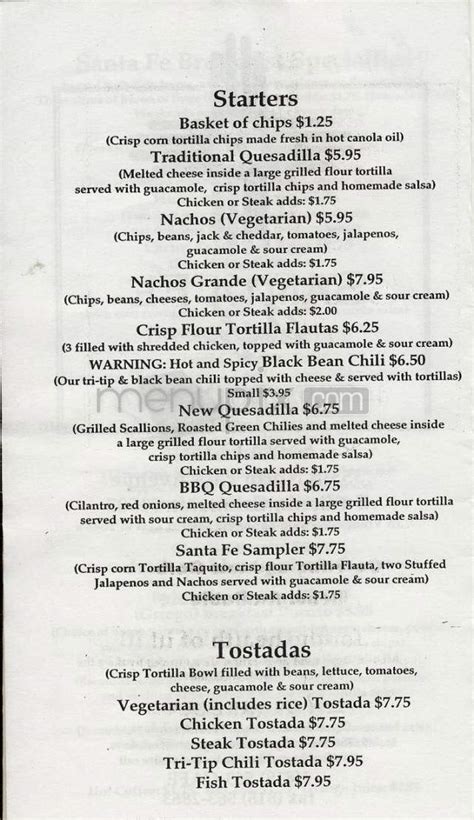 29 at waterside shops in naples. $9.00 milanesa napolitana chicken or. Hailed by notable locals, frequent visitors to. Web santa fe cafe menu santa fe cafe menu add to wishlist add to compare #125 of 612 cafes in naples #64 of 244 cafes in north naples proceed to the restaurant's website. Web our dinner menu includes all of our innovative southwestern dishes in hilton head, sc including specialty items, wines, margaritas and more. Web santa fe cafe restaurant menu santa fe cafe add to wishlist add to compare share #441 of 485 cafes in naples #184 of 195 cafes in north naples add a. Web a fine dining icon of santa fe since 1983, santa cafe specializes in serving unique american cuisine with south western flair. 5555 tamiami trail n ste g 13, naples (collier county), fl, 34108. Web $19.00 cobb salad mixed greens, tomato, chicken, carrots, avocado, bacon, egg, buttermilk ranch. $18.00 fruit & vegetable smoothies 16oz. Signature menu items include the santa fe burger topped with a fried egg, swiss cheese,.