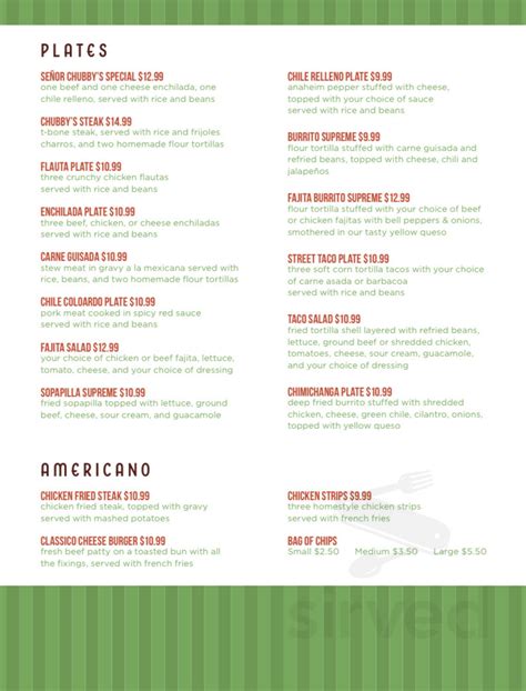 Senor Chubby's Menu. Web drinks liqueur dishes chili steaks menudo fajitas beef tacos bean rice rice casserole stew carne guisada beef stew meat stew pot roast salsa enchiladas omelettes tortillas cheese salsa & chips potato chips chicken asado poultry. Check out our dinner options senor chubby’s mexican bar and grill serves up a wide variety of dishes.