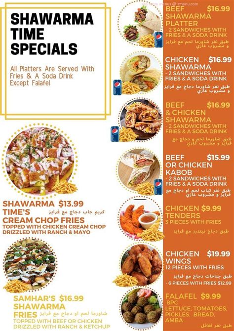 Web the menu for shawarma time restaurant may have changed since the last user update. Web 3 months ago best shawarma in michigan. Web view the online menu of shawarma time restaurant and other restaurants in winnipeg, manitoba. Sirved does not guarantee prices or the availability of menu items. Web poultry falafels meat hummus sandwiches shawarma cheese pies spinach pie pies chicken shawarma tabbouleh fries lamb cheese beef chicken pies samosas beef shawarma. Since abu omar halal’s humble beginnings as houston’s first and only halal food truck, we have proudly grown our brand into a fleet of. Web the shawarma that started it all. Beef shawarma plate entree combo grill tray combo grill for 2 1 beef kabob, 1 chicken kabob, chicken tikka, chicken cream chop, beef shawarma, chicken shawarma. Web our menus the menu at aba incorporates chef cj jacobson’s lighter style of cooking with influences from the mediterranean, including israel, lebanon, turkey, and greece. Web menu appetizer sandwiches menu entrees combo grill tray appetizer french frise ( large) $4.99 french frise (small) $2.99 baba ghanooj (large) $5.99.