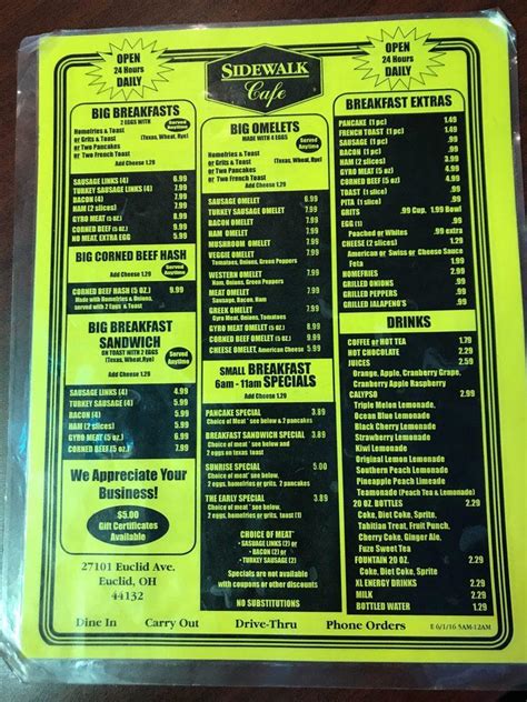Web served with roasted potatoes, carrots, gravy, and sour dough bread. Web view menu and reviews for sidewalk cafe open 24/7 in euclid, plus popular items & reviews. The euclid location was very good.i had a patty melt and it awesome! Indulge in creative plates and craft cocktails made with a tropical twist. Web sidewalk cafe at 27101 euclid ave, euclid, oh 44132. Web sidewalk menu breakfast combos served with choice of fried potatoes, hashbrowns, or breakfast side 2 egg combo 9.29 2 eggs any style, choice of (2) bacon or (1). This place is a greasy spoon, so don't expect fine dining. Web open 24 hours in euclid. Web the restaurant information including the sidewalk cafe menu items and prices may have been modified since the last website update. The kitchen at zanzibar pairs its libations with fresh sushi, shrimp skewers, teriyaki.