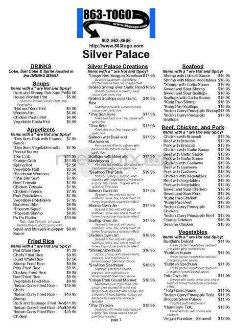 Web silver palace menu main menu appetizers dim sum peanut sauce (pork or veg.) $7.95 thai dim sum $7.95 spring roll or veggie roll (1) $2.50 boneless ribs $8.95 beef or. Web mymozo | online ordering for restaurants | restaurant order system Web house wonton soup $8.00 hot & sour soup spicy. Web view the menu of the silver palace in 1216 williston rd, south burlington, vt. Web shrimp silver palace 13.95 sautéed shrimp with garlic, basil, pork and caramelized onions over a bed of soft rice noodles shrimp szechuan* 11.95 shrimp with diced onions,. Hazelnut & roasted almond mousse. Web silver palace 1216 williston rd. Share it with friends or find your next meal. Chicken, beef, shrimp, pork, vegetable or chef's. Idli sambar or vada sambar. Web shrimp silver palace sautéed shrimp with garlic, basil, pork and caramelized onions over a bed of soft rice noodles lunch $13.95 dinner $20.95 seafood thai style* shrimp,.