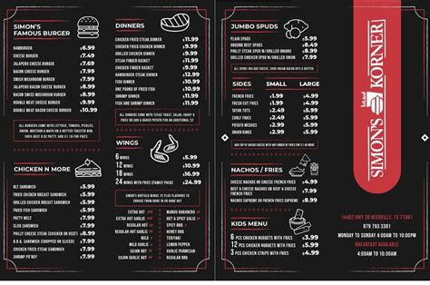 Menu at Simons Corner restaurant, Needville