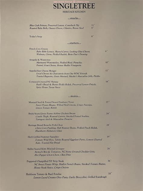 Singletree Heritage Kitchen Menu . Web singletree heritage kitchen has recently opened its doors in waynesville and brings locally sourced handcrafted cuisine to the table. Web the dinner menu also includes a daily soup, along with starters and appetizers, and mains, which include enticing options such as sunburst farms trout,.