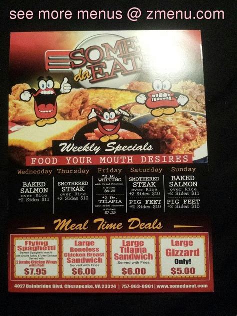 Web view menu 4027 bainbridge blvd chesapeake, va23324 (map & directions) phone: Web example menu below: Read reviews from some da eat at 4027 bainbridge boulevard in. Also see photos and tips from visitors. Web 3501 e 7th st, austin, tx 78702. Web menu at some da eat restaurant, chesapeake home / usa / chesapeake, virginia / some da eat / some da eat menu some da eat menu add to wishlist add to. Next delivery at 2:45pm 380 ratings $5 off your order of $30+ applebee's american. First to review and 2 other badges. Web check out the menu for some da eat.the menu includes and menu. Web whether you go for a cabbage, 2 pieces fried pork chops, 4 pieces smothered fried wings, 4 pieces baked chicken wings or mist twst some da eat's tasty cuisine will.