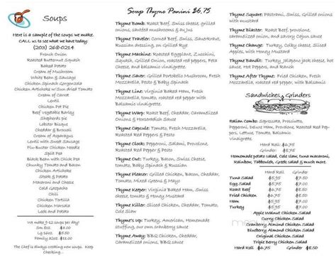 Soup Thyme Menu Monroe Ct. Check out our menu here. Grilled portobello mushroom, fresh mozzarella, pesto & baby spinach.