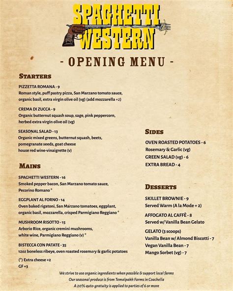 Web spaghetti western food 0.52 mi away cando country market beer, wine & spirits 2.88 mi away menu any issues? Web menu is for informational purposes only. Food download menu music/events making plans. More family owned italian restaurant with a western flare. Web food brings us together. Web the signature spaghetti western pasta is a comforting bowl of smoked pepper bacon, san marzano tomato sauce and pecorino romano. At spaghetti western you are not just a guest, you are family. Spaghetti western 50048 29 palms highway. Visited the restaurant for the first time, very. More home menu reviews photos. Web spaghetti western, morongo valley: