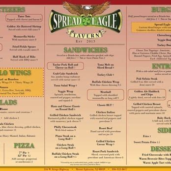 Spread Eagle Tavern Lunch Menu. Baked sliced ciabatta topped w/ basil pesto, fresh tomatoes, red onion, feta & parmesan cheese drizzled w/ olive oil & a balsamic reduction. Web yes, spread eagle tavern has a lunch menu and yes they take reservations over a year ago add your answer answer posting guidelines more questions about this restaurant answer is there a dress code?
