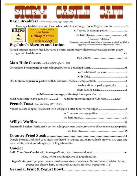 Web storm castle cafe can be recommended for good biscuits, french toasts and french pancakes. Our coffee and water glasses were always full. Build your own omelette, french toast, monte cristo, and waffles. Come here with children, this place provides an varied kids’ menu. Storm castle cafe is amazing! We had so many things on their menu: People mention that the service is. Everything was divine and such generous portions. Thank you 406.586.0395 meet the owners You are free to download the storm castle café menu files.