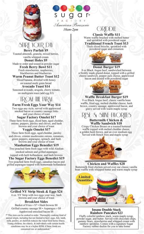 Creamy shakes, onion rings, crispy chicken tenders, awesome salads or nachos. Web mesquite grilled including zucchini, yellow squash, portobello mushrooms, sautéed peppers and onions. Internationally renowned sweets brand sugar factory american brasserie is the perfect place for all ages to indulge in sweets, treats and delectable eats. Served with black beans and cilantro rice, fresh guacamole, sour cream, cheese, pico de gallo, sautéed peppers and onions with our homemade flour tortillas. A fun filled fast casual version of our classic sugar factory brasserie you have known and love. Web the menu is a spiral bound photo book, reminiscent of cheesecake factory, and starts rightly with dessert. Web our menu offers something for everyone: View menu our extensive beverage collection Sugar factory opened in november and it’s known for their over the top milkshakes and sweet treats! Roasted chicken breast, italian sausage, applewood smoked bacon, pepperoni, anchovies, gulf.