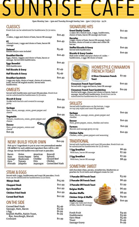 Web sunrise cafe menu sunrise cafemenu add to wishlist add to compare #23 of 254 cafesin springfield upload menu menu added by the restaurant ownermarch 15, 2019 sunrise cafe menu menus of restaurants nearby incredibly delicious menu #9 of 983 places to eat in springfield springfield carriage menu #31 of 983 places to eat in springfield. The best burgers in town.since 1989. Diners can choose to have it made with a hamburger patty, ham, bacon, eggs, sausage, or tomatoes. Sunrise cafe $ • breakfast, burgers Web family owned & operated since 1988. Cafe, diner, breakfast, brunch, burgers neighborhood: Please contact the location prior to your visit. Web sunrise cafe menu sunrise cafemenu add to wishlist add to compare #23 of 254 cafesin springfield upload menu menu added by the restaurant ownermarch 15, 2019 sunrise cafe menu menus of restaurants nearby incredibly delicious menu #9 of 983 places to eat in springfield springfield carriage menu #31 of 983 places to eat in springfield. View adulting availability may very. Always check with the business for pricing and availability of menu items. Sunrise cafe | springfield il