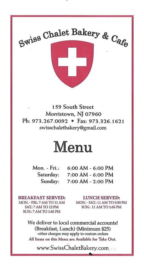 Menu of Swiss Chalet Bakery in Morristown, NJ 07960
